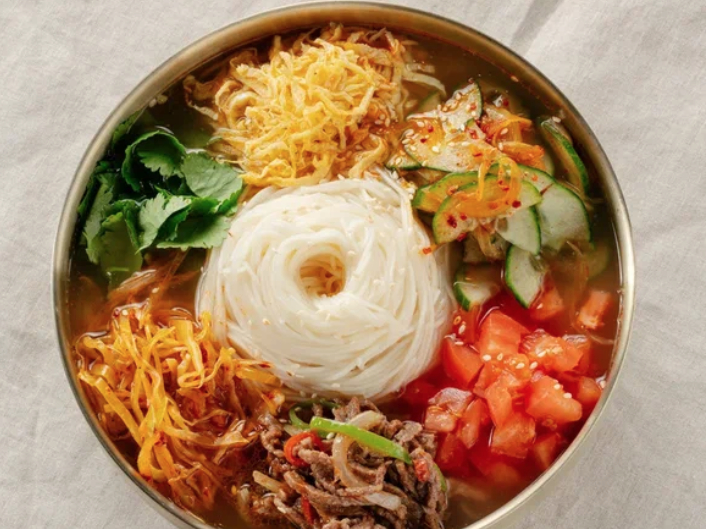 – Куксу! Это культовое корейское блюдо на томатном бульоне с пшеничной лапшой, говядиной, помидорами и огурцами я готов есть утром, днём и вечером буквально каждый день. Куксу едят горячим или холодным, а я даже зимой беру холодный – очень освежает.