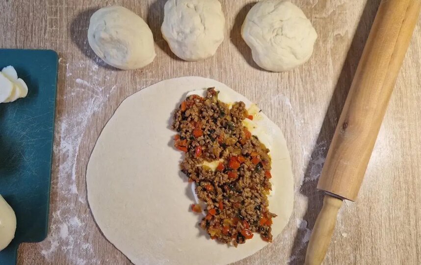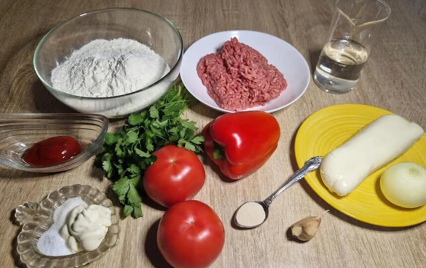 Для теста: 500 г муки, 1 ч. л. сухих быстродействующих дрожжей, по 1 ч. л. соли и сахара, 2 ст. л. майонеза, 200 мл воды. Начинка: 300 г фарша, 1 зубчик чеснока, луковица, 2 помидора, 1 болгарский перец, 1 ст. л. томатной пасты, пучок зелени, 160 г моцареллы. Соль, перец – по вкусу.