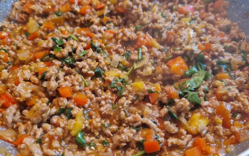 На сковороде с небольшим количеством оливкового масла обжарить мелко нарезанный лук, добавить фарш, слегка обжарить, добавить измельчённые овощи, чеснок, томатную пасту, соль, перец и зелень. Протушить 10–15 минут.