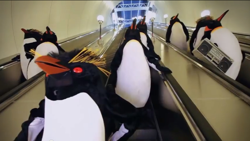 Мы видим, как пингвины появляются то на одной станции метро, то на другой. Вот они едут в вагоне поезда, обнимая пассажиров, а вот пританцовывают на "Международной", где устроили настоящий концерт.
