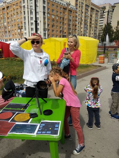 На небольшом столе наплощади перед ГПНТБ разместились, собственно, сам телескоп, актуальные снимки солнечной активности со спутника и специальные фильтры, благодаря которым можно без вреда для глаз смотреть на солнце. Астрономическое занятие проводила Мария Широносова – создатель проекта «Выше крыш».