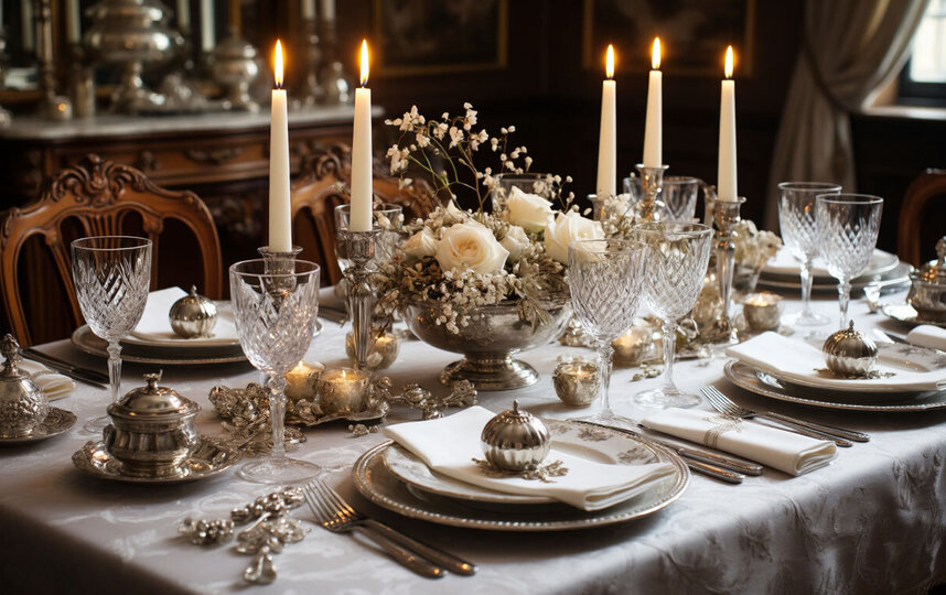 Главную роль здесь играет серебро: креманки, подносы и приборы с изящной резьбой. Центральную композицию можно делать камерной – с хвойными ветвями или лаконичными подсвечниками, создающими тёплое, приглушённое освещение.