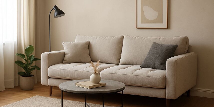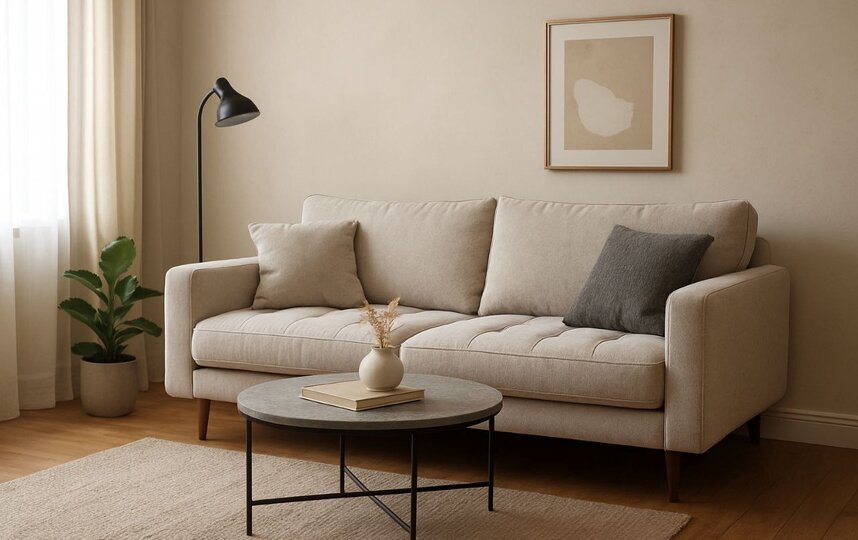 Отказ от громоздкости. Первым делом вычеркните из списка массивные угловые диваны. Идеальная замена – прямые модели длиной до 190—200 см, желательно на высоких (15—20 см) ножках. Они создают ощущение лёгкости. Для экономии пространства можно выбрать модель с одним узким и одним широким подлокотником.