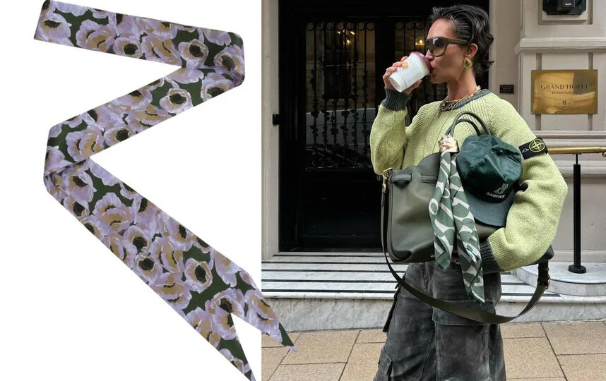 – Что касается шарфов – речь про тонкие полупрозрачные длинные ленты, часто с бахромой на концах. Их повязывают на шею или на талию как пояс-кушак. Тренд короткий и специфичный, но если хотите почувствовать себя на пике моды и добавить в базовые образы немного французского шика и интеллектуальности – попробуйте. Что касается платков – мы их снова носим на шее, либо подкалываем той самой брошью к пальто или пиджаку, либо завязываем на ручку сумки.