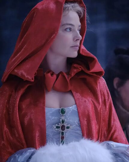 Алый плащ с капюшоном сразу задаёт высокий градус страсти. Массивный крест, инкрустированный камнями в духе Chanel, контрастирует с нежным корсетом – здесь легко читается эстетика Тюдоров, но с глянцевым, почти модным блеском. Меховая муфта добавляет суровой "дикости" северных поместий, и Кэти предстаёт не провинциалкой, а королевой вересковых холмов.
