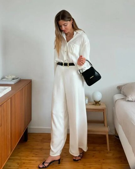 - Идеальные ткани – хлопок и лён: дышат, держат форму и выглядят благородно. Атлас тоже остаётся в игре, но требует более спокойных аксессуаров, чтобы образ не ушёл в вечерний.