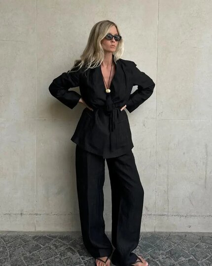 Брюки – от широких и длинных (идеальны для города и выглядят максимально "дорого") до укороченных, которые добавляют образу лёгкой небрежности. Более романтичный вариант – модели с мягкими рюшами по низу: они будто созданы для отпускных фото.