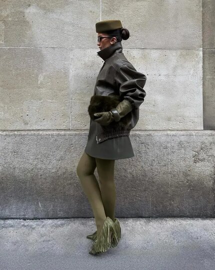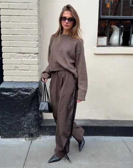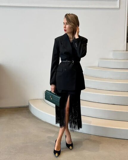 – Образ может состоять из кожаной юбки, как бы порезанной по нижнему краю, плотного трикотажа сверху, структурированного пальто или куртки с втачным плечом и сапог на каблуке, – пояснила стилист. – В целом бахрому в любой эстетике очень хорошо сочетать с прямыми, строгими или даже расширенными плечами – так создаётся баланс форм.