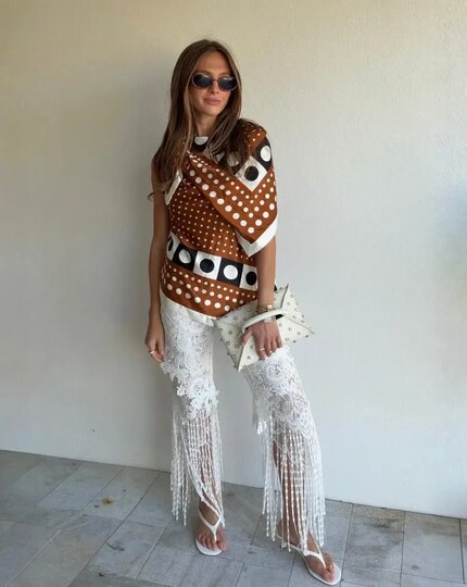 – Она сочетается с шёлком, тонким трикотажем, кроше, рюшами и мелким принтом. Например, платье в пастельном оттенке с небольшой бахромой, дополненное босоножками на плоском ходу и маленькой сумочкой, сделают образ нежным и лёгким, – рассказала эксперт.