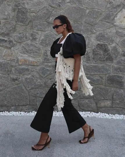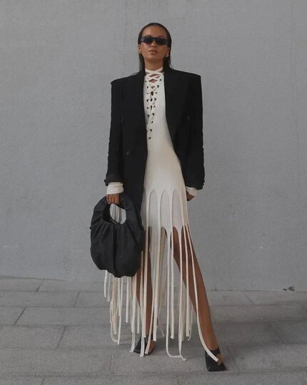 - С "лапшой" легко переборщить. Поэтому стилисты советуют соблюдать правило одного акцента: если в образе есть бахрома, добавьте максимум ещё один выразительный элемент – цвет, принт, фактуру или украшение.