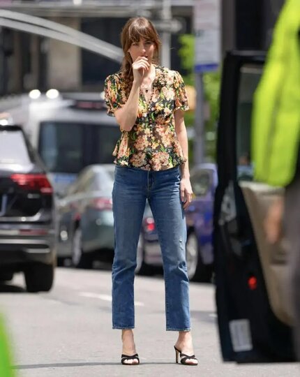 Новый образ – блуза с цветочным принтом в тёплых тонах, прямые джинсы и мюли – демонстрирует расслабленную романтичность сезона. Как отмечает стилист, укороченные джинсы прямого кроя уравновешивают женственный верх, так что образ становится идеальным для ежедневного выхода.