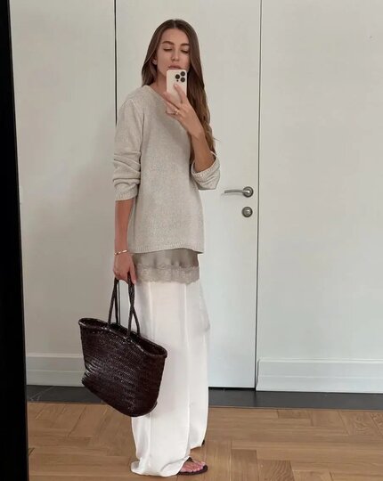 Плетёная сумка – уже акцент, поэтому важно соблюдать баланс.