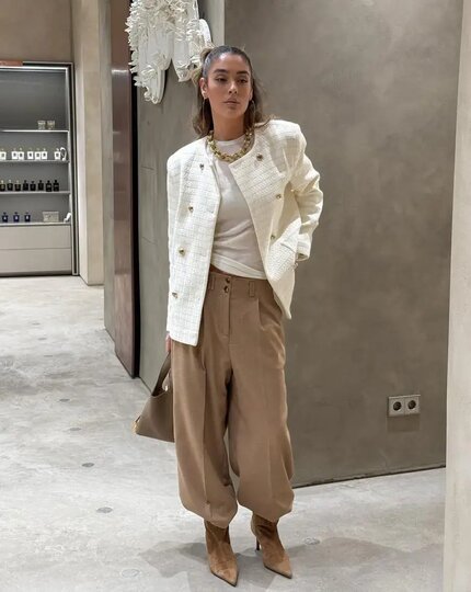 Используйте сапоги: брюки-сигареты или легинсы, прилегающие к ноге, идеально сочетаются с жокейскими сапогами, сапогами-трубами или чоперами, создавая безупречный гладкий силуэт.