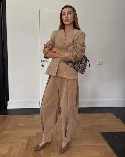 – Чтобы сбалансировать пропорции, выбирайте для широких брюк обувь с заострённым мысом. Можно даже на плоском ходу, например, лоферы или слингбэки (с ремешком на пятке). Такая обувь не обязательно должна быть очень узкой, достаточно небольшого сужения носка. Это визуально сделает ноги длиннее и пропорциональнее к их ширине, – объясняет персональный стилист Анна Притчина.
