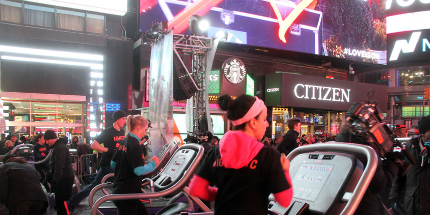 На один вечер вечно куда-то спешащий Нью-Йорк забегал по-настоящему. На самой известной площади города – Таймс-сквер (той, что день и ночь горит огнями десятка экранов со всевозможной рекламой) – появилось несколько беговых дорожек.