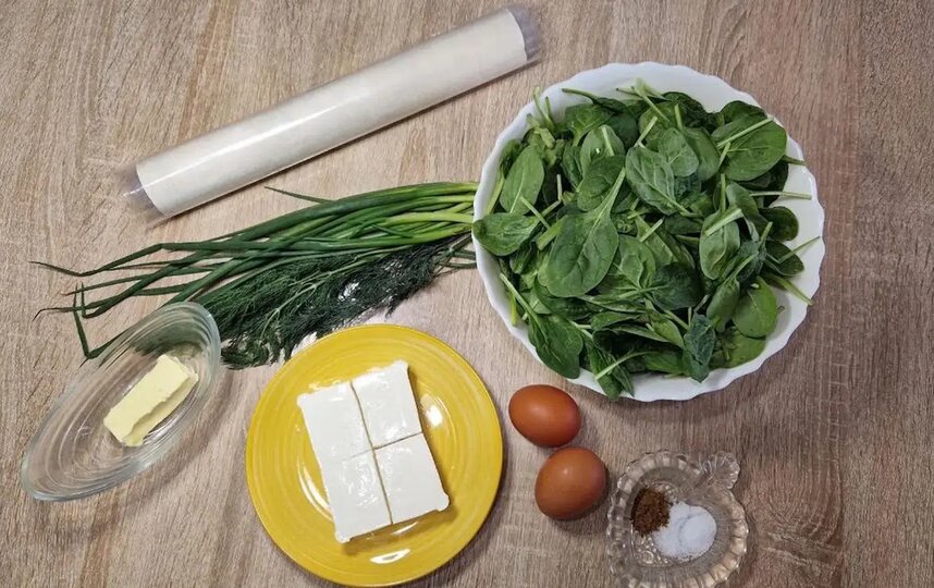 400 г теста фило, 300 г феты (или любой рассольный сыр), 400 г свежего шпината, пучок зелёного лука и укропа, 2 яйца, 30 г сливочного масла (можно использовать оливковое масло), 0,5 чайной ложки молотого мускатного ореха. Соль – по вкусу.