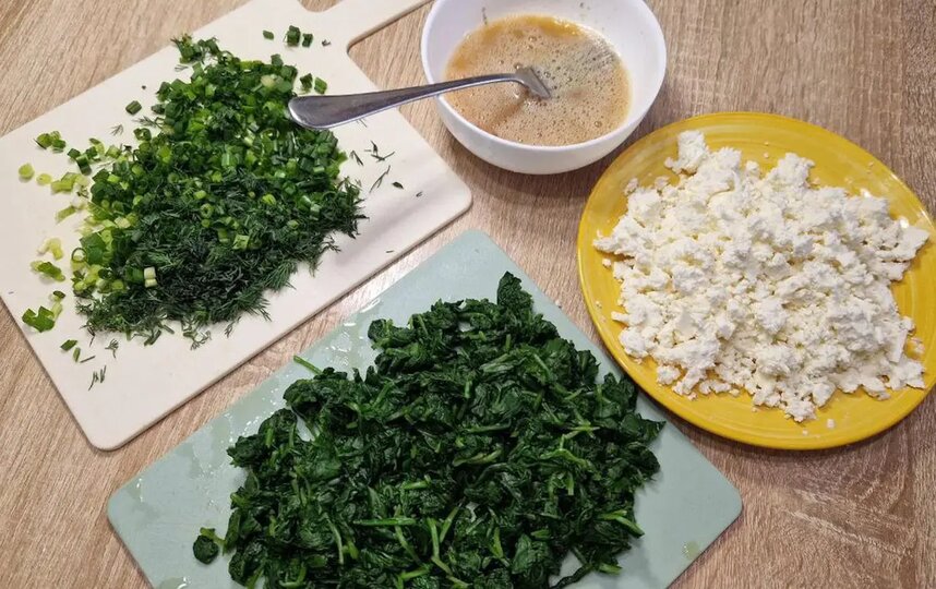Шпинат промыть и запарить кипятком на 2–4 минуты. Отжать и измельчить. Вымытые лук и укроп мелко порезать. Яйца взбить в отдельной тарелке с солью и мускатным орехом. Смешать шпинат, зелень, яйца и размятый сыр фета.