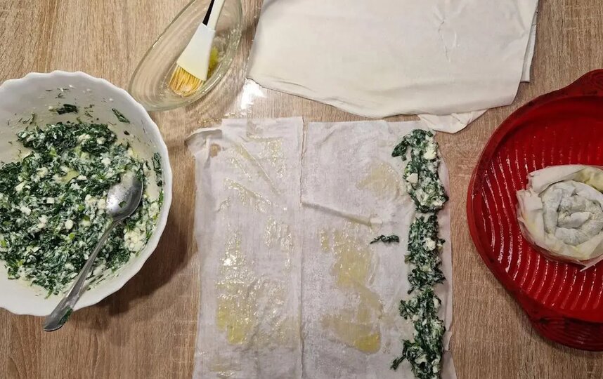 Спанакопиту можно делать несколькими способами. Самый эффектный – скручивать рулетиками тесто и начинку.