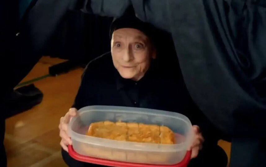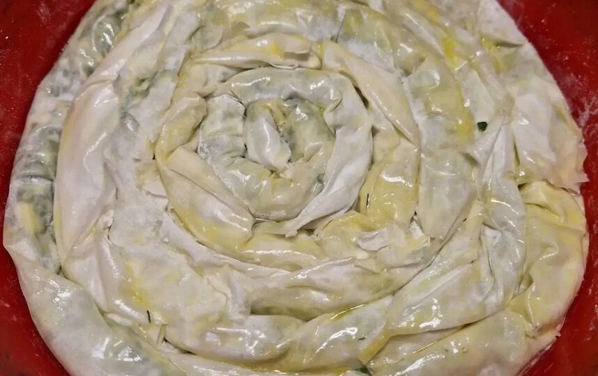 Бабушка во второй части комедии пряталась с пирогом спанакопита, который был приготовлен слоями с чередованием теста и начинки.