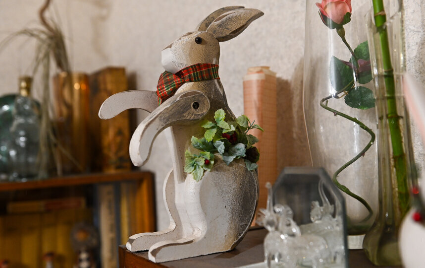 Статуэтки из дерева, фарфора и керамики расставлены по всему дому. Один заяц везёт в тележке сантиметровую ленту, другой придерживает ежедневники, третий охраняет соль – это солонка.