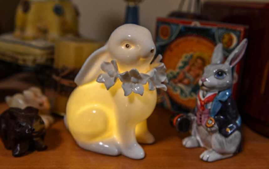 На кухне виднеются доска и фартук с зайцами. Фарфоровый ушастый притаился на женском столике. У кровати стоит ночник в форме пугливого зверька. Невооружённым глазом видно, что в этом доме проживает коллекционер.