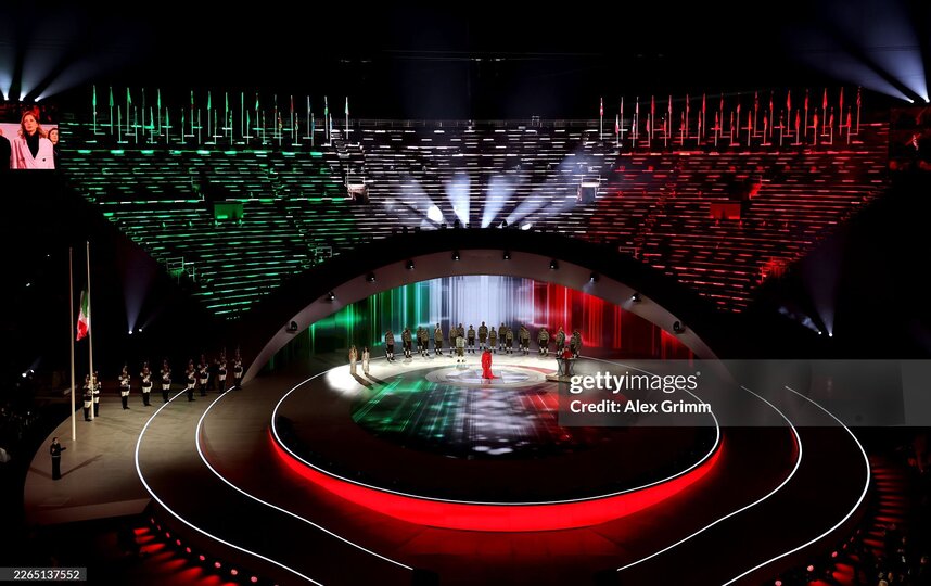 Шоу стартовало с масштабной хореографической композиции: танцующие артисты изображали итальянский флаг. Параллельно на арене появилась известная модель Ота Карлотта Бертотти, которая с гордостью пронесла флаг Италии, а затем передала его паратриатлонистке Веронике Йоко Плебани. Первая официальная часть завершилась проникновенным исполнением гимна Италии певицей Мими Карузо.