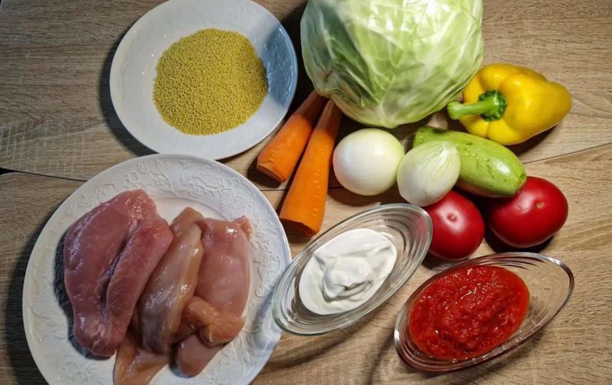 1 кочан плотной капусты, 600 г мясного фарша (я делала из филе курицы и индейки), 150 г пшена, 2 моркови, 2 луковицы, 2 помидора, 1 кабачок, 1 перец, 3–4 ст. л. сметаны, 6 ложек томатного соуса, 200 мл воды, соль, молотый перец – по вкусу, лавровый лист и чеснок – по желанию.