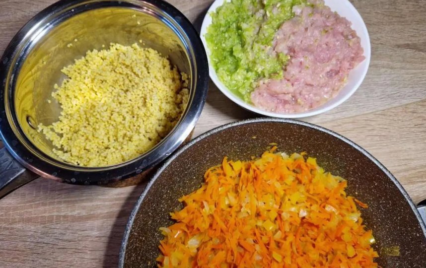 Пшено можно не варить, а просто замочить на несколько часов. У меня времени не было, поэтому я проварила пару минут и дала настояться, пока занималась овощами. Нарезанный лук, перец и натёртую морковь отправить на сковородку и обжарить (я протушила, добавив чуть воды) в течение 10 минут. Из мяса сделать фарш, прокрутив и небольшой кабачок для сочности (по желанию).