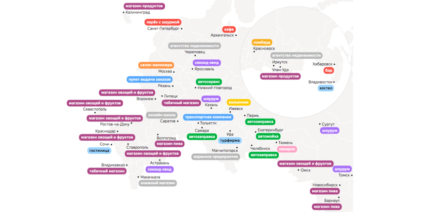 Например, в Сочи явный интерес к открытию гостиниц. В Краснодаре – магазины овощей и фруктов, а в Петербурге – открытие точек по продаже шавермы.