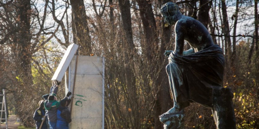 Скульптуры в "Царском Селе" начали готовить к зиме. За неделю с небольшим планируется укрыть в специальные футляры более 60 статуй, рассказала пресс-служба музея-заповедника.