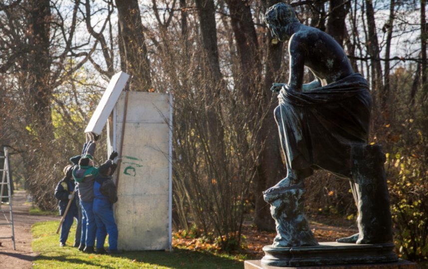 На зимовку уже ушёл Мраморный фонтан в Собственном садике Екатерининского парка. Его помыли, обработали специальным составом, а затем накрыли защитной конструкцией. Затем короба появились у фигур китайцев на Большом китайском мосту в Александровском парке. В ближайшее время должны преобразиться гальванопластическая коллекция на Гранитной террасе и Рамповой аллее, "Девушка с кувшином" в Екатерининском парке, венецианские скульптуры на Эрмитажной аллее и вдоль фасадов Екатерининского дворца.
