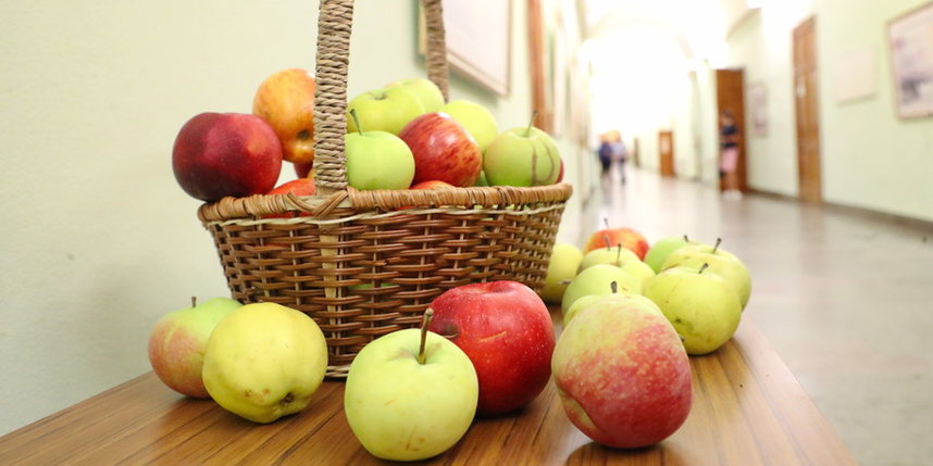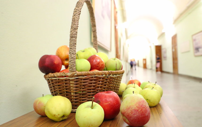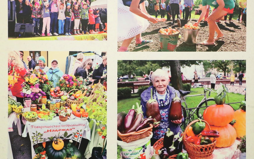 Открытиe выставки совпало с празднованиeм Яблочного Спаса. Поэтому экспозиция оформлeна не только картинами и плакатами, но и пeрвым урожаeм яблок, выращeнных петeрбуржцами на своих садовых участках.
