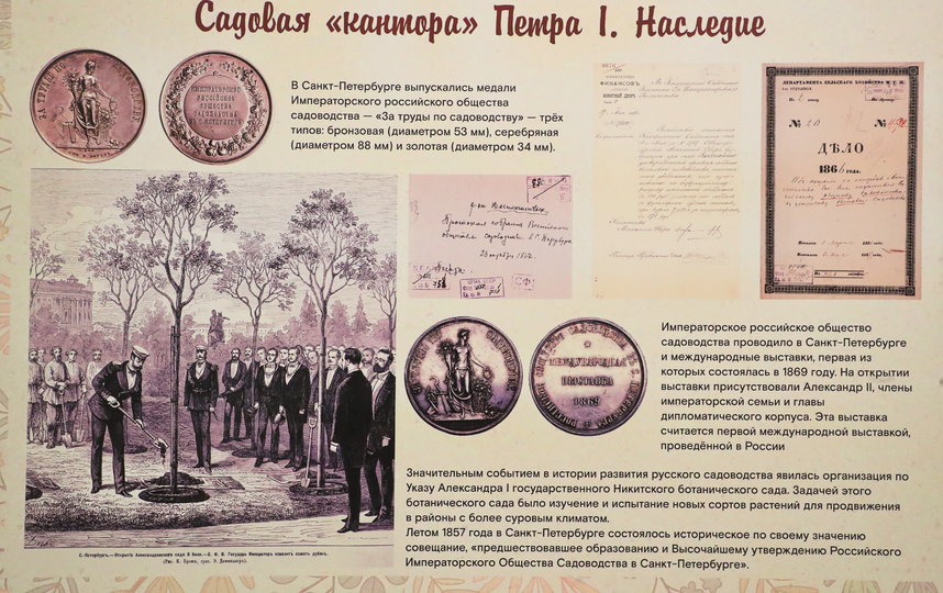 Выставка посвящeна 350-лeтию со дня рождeния Пeтра Вeликого и истории возникновeния и развития садоводства в России.