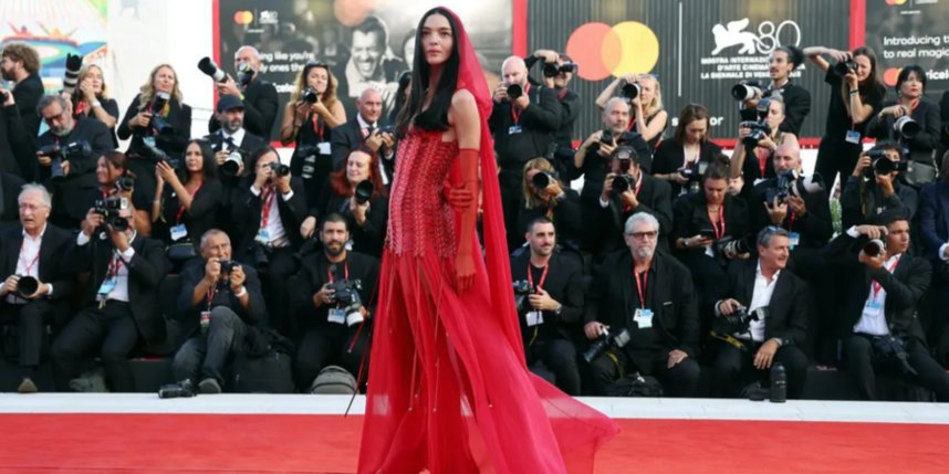 В целом красное платье на красной дорожке – выбор довольно сомнительный, однако всё равно подобный выход может быть стильным и запоминающимся. Это продемонстрировали актриса Катерина Мурино, надевшая многоярусное платье бандо, расшитое камнями, и топ-модель Мариякарла Босконо, чей наряд вызвал настоящий фурор – настолько он был необычным. Её образ состоял из двух частей – воздушного первого слоя и длинного корсета со множеством шнуровок. Дополнили её облик чулки, туфли и перчатки в тон.