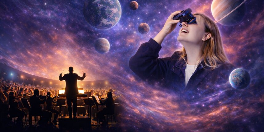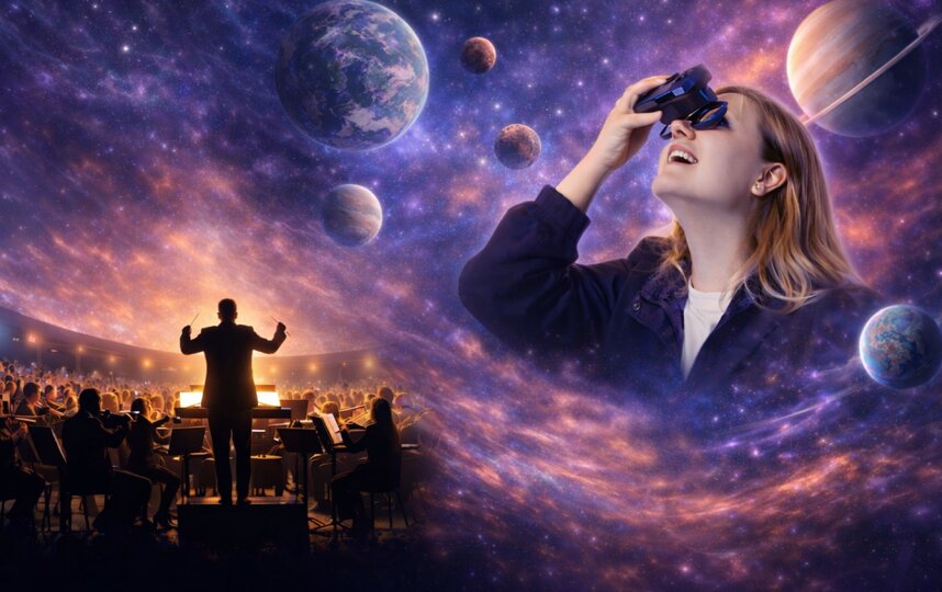 В основе шоу лежит идея полного погружения зрителя в музыкальное повествование. В первой части вечера под управлением дирижера Михаила Голикова симфонический оркестр "Таврический" (более 50 музыкантов) исполнит знаковые произведения: "Болеро" Мориса Равеля и "Симфонические танцы" Сергея Рахманинова под масштабные космические проекции на крупнейшем в мире куполе. Это создаст эпичный пролог к главному событию.