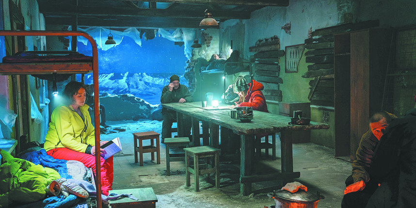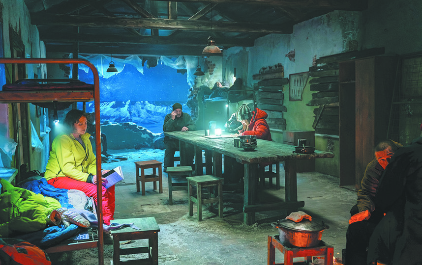 Пока актёры готовятся к съёмкам новых дублей, нам удаётся попасть внутрь казармы. Обшарпанные стены завешаны плакатами советских времён с инструкциями по оказанию первой медицинской помощи в горах, на полу валяются спальные мешки и походные рюкзаки, по углам стоят две двухъярусные железные кровати. Посреди комнаты – длинный стол с железными мисками, кружками и ложками, чуть в стороне тлеет небольшой костёр. В одной из стен зияет дыра, через которую отчётливо видны горы.