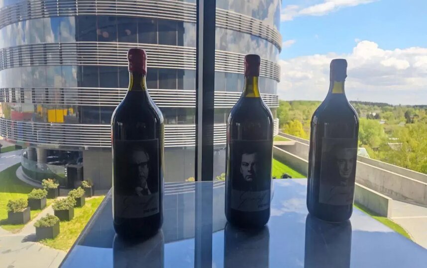 Именные бутылки с вином с фотографиями акционеров на фоне одного из корпусов "Галактики".