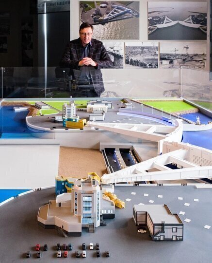Съёмки нового документального фильма начались на территории Дирекции комплекса защитных сооружений – в музее, где представлен макет дамбы: затворы, мосты, по которым движутся машины, а под ними – синева Финского залива.