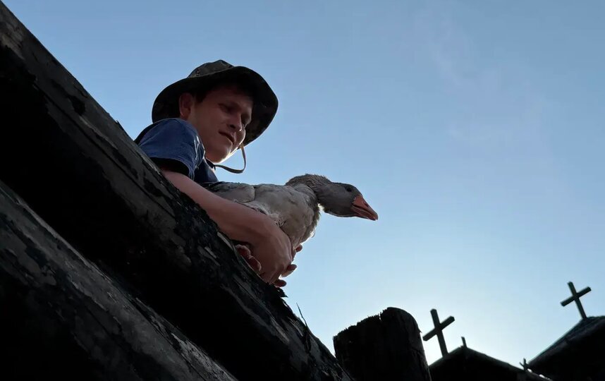 Репетиции уже проведены, вот только начало сцены решают немного изменить. Открывать сцену должны гуси – одного решают выпустить не со стороны, а чтобы он прилетел в кадр сверху. Для этого один из ассистентов поднимается по лестнице к вершине рядом стоящего забора с гусём в руках. Пернатого такой расклад явно не устраивает – гогот слышно на всю площадку.