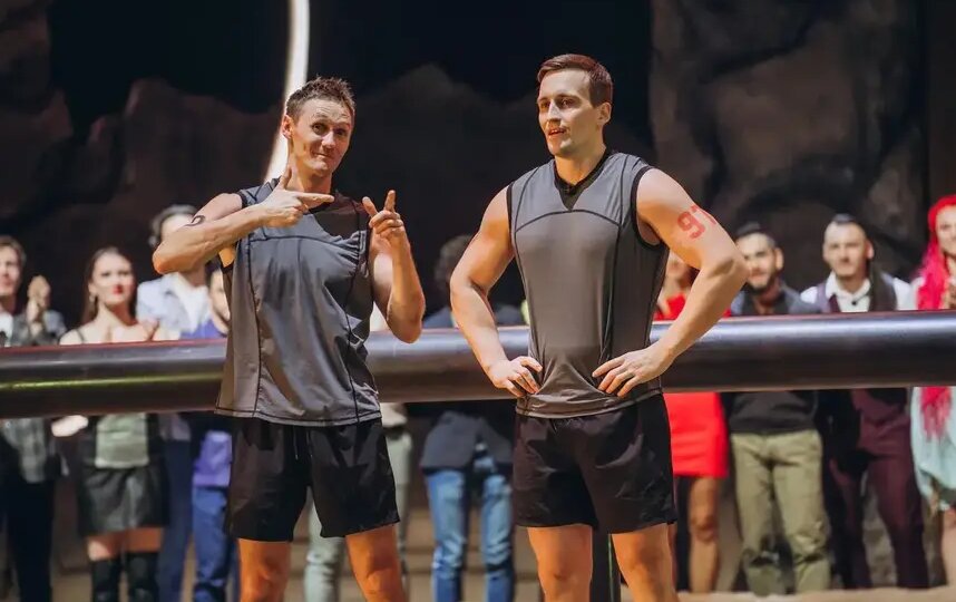 Российский лыжник и олимпийский чемпион Никита Крюков (слева) и учитель физкультуры Николай Бобылев в суперфинале шоу "Титаны 2".