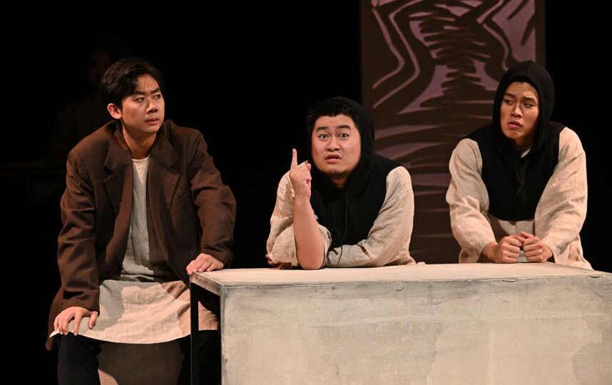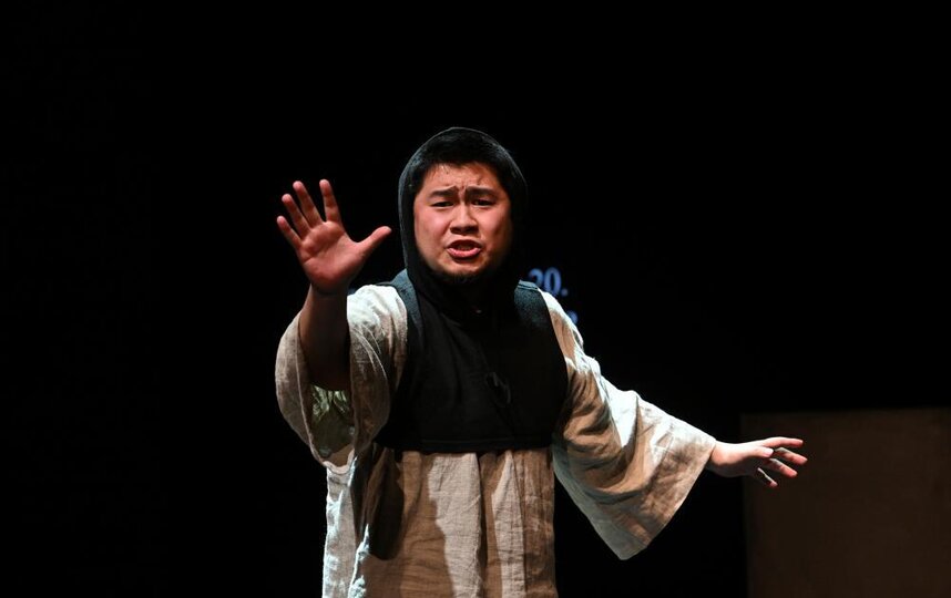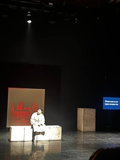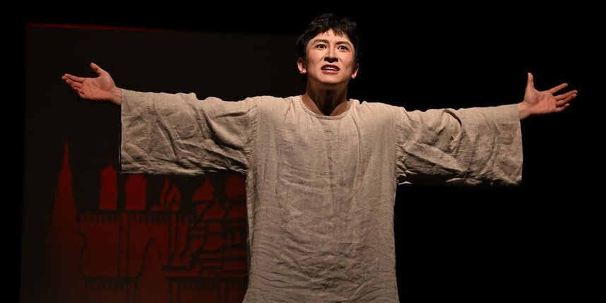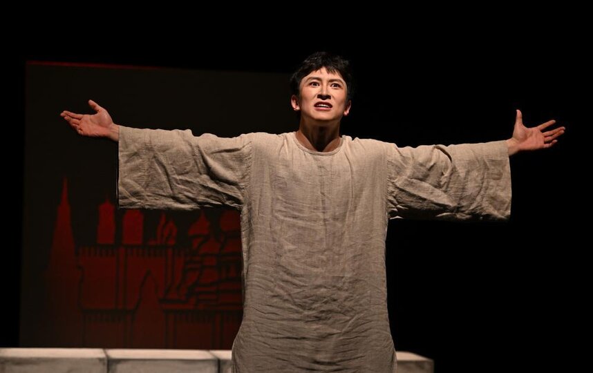Пьесу "Играем Бориса Годунова" в учебном театре на Моховой поставили, как это следует из названия, по одному из самых известных и значимых произведений Александра Сергеевича Пушкина. В отличие от оригинала, определённого автором как трагедия, постановщики пьесы расширили рамки жанра и представили собственную сценическую трактовку событий российского Смутного времени. Тем, кто слегка подзабыл школьную программу, напомню: в центре сюжета – трагическая фигура царя Бориса Годунова, которого мучает совесть из-за убийства ребёнка, царевича Димитрия, законного наследника Ивана Грозного. Пушкин противопоставляет мятущемуся и страдающему Борису одного из самых известных российских авантюристов – беглого монаха Гришку Отрепьева, который выдает себя за выжившего царевича и очень быстро проходит дорогу от нищего странника до властителя России. "Играем Бориса Годунова" следует пушкинскому произведению практически буквально (с поправкой на перевод на китайский язык) и в то же время является совершенно отдельным и особенным произведением.