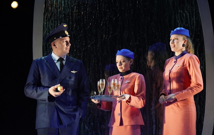 Визуально спектакль очень поэтичный. Гигантское окно самолёта видят зрители с самого начала. Морозные узоры на стекле иллюминатора сверкают в свете софита. Выглядит волшебно и натурально – так, будто ты действительно паришь в тысячах метрах над землёй. По углам сцены разбросаны красные яблоки. Целый чемодан фруктов в одном из отрывков привозит Наташа из очередного рейса. Позже эти яблоки полетят в Евдокимова во время ссоры… А ещё главная героиня всегда возвращается домой с охапкой цветов, которые собирает в городах, где побывала.