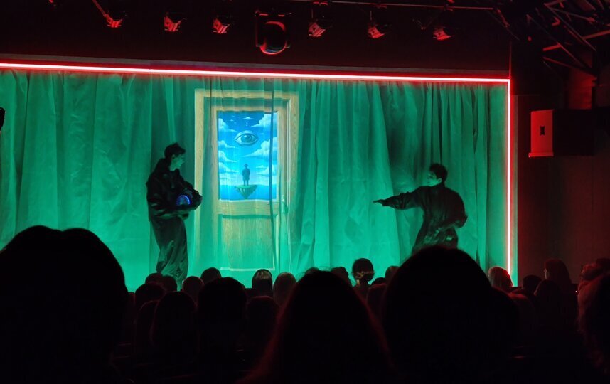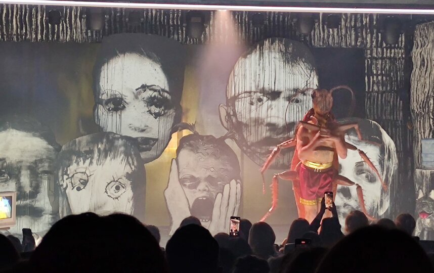 Поначалу, пока герои продвигаются вглубь бункера, ты ещё не понимаешь, чего ожидать от постановки, хотя всё уже выглядит слишком сюрреалистично. Ещё какое-то время персонажи пытаются убедить присутствующих в том, что драма тут действительно есть, но через пару десятков минут всё окончательно сваливается в гротеск и дальше уже не отпускает. Этому способствуют декорации, грим, мимика актёров и общая подача, а также песни из репертуара 90-х, включая Таню Буланову. Когда на сцене ритмично под танцевальные вещи отплясывает двухметровый таракан, просто невозможно сохранить самообладание и думать о высоком, заложенном в творчестве Эсхила и Сартра. Всё на финишной прямой подытоживает спектакль в спектакле, метаирония в формате (спойлер!) звонка от режиссёра актёрам, которые почти закончили свои дела на сцене.