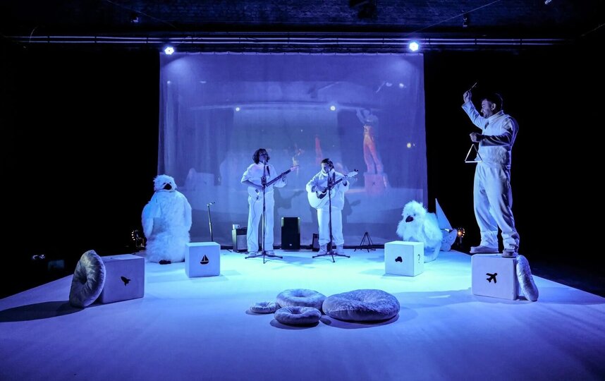 Сценография у спектакля "Пингвин, поморник и полярник" лаконичная, даже несколько игрушечная, напоминающая детскую комнату в торговом центре, где есть подушки, ростовые куклы, деревянные игрушки. Антураж здесь не менее важен, чем непосредственные участники действия, а все объекты по максимуму используются для передачи сюжета в минималистичном ключе.