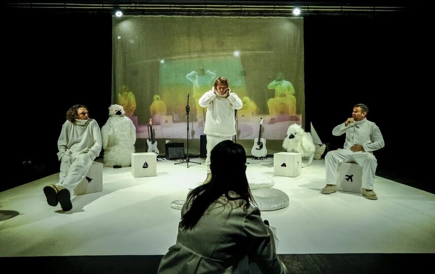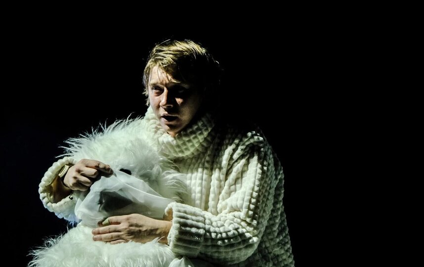 Следующий уровень постановки – влоги, которые записывает главный герой для родных, как некий образ связи с внешним миром и попытка передать эмоции и чувства. Изображение на большой экран транслируется с камеры, которую держит единственная актриса на сцене.
