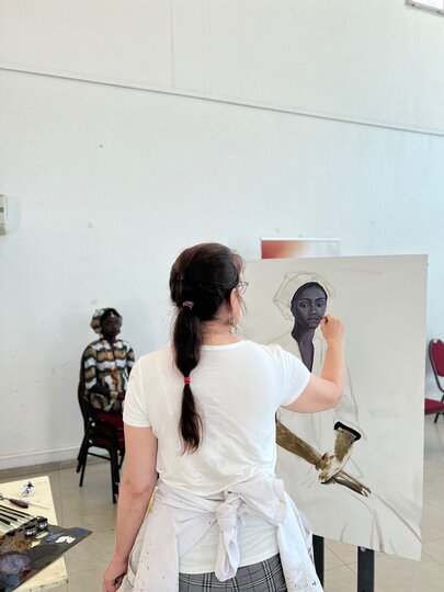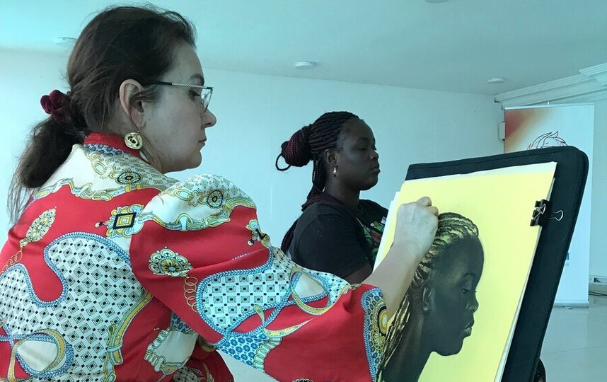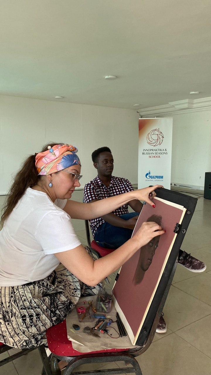 "В Африке я оказалась в мае 2022 года, – рассказывает Анастасия. – Там проводилась первая зарубежная сессия образовательного проекта "Школа Иннопрактики и Русских сезонов". Мы, педагоги петербургской Академии художеств имени Ильи Репина, художники и скульптуры, знакомили иностранных студентов с богатым историко-культурным наследием нашей страны. Я проводила занятия, мастер-классы для начинающих художников из семи африканских стран".
