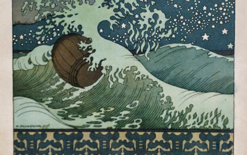 – Судя по работам к "Сказке о царе Салтане", Билибин прекрасно знал японскую графику, – комментирует куратор выставки. – Иван Яковлевич, рисуя море, цитирует некоторые элементы волны знаменитого японского художника Кацусики Хокусая. Далее эту работу цитирует "Союзмультфильм" в одноимённом анимационном фильме. Получается такая связь между японским художником, Билибиным и студией "Союзмультфильм".