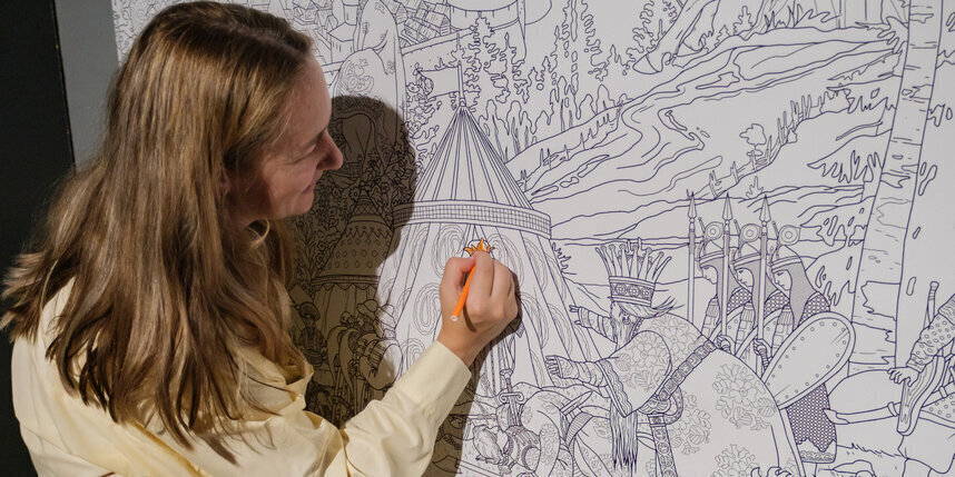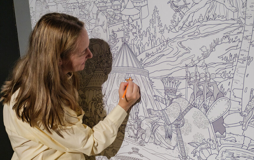– Во время практики они отрисовали вручную интерактивную раскраску, – поясняет Анастасия Воронина-Даринцева. – Это микс сказок, иллюстрированных Билибиным. Рядом можно найти фломастеры, выбрать себе героев и раскрасить их. Это очень успокаивающая история. Полотно большое, при желании можно заняться творчеством всей семьёй.