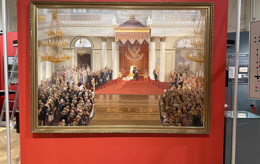 – Полотно размером 166×237 см было написано по инициативе великого князя Владимира Александровича, тогдашнего президента Академии художеств, с фотографии, сделанной с хоров Георгиевского зала. На нём запечатлен момент тронной речи императора, обращённой к выборным депутатам – как к депутатам Государственной думы, так и членам Государственного совета, которых Николай II назвал "лучшими людьми" России. Картина интересна не только масштабом события, но и строгим требованием, предъявленным художнику: "все помещённые на ней были изображены с точностью портрета". Поэтому большинство героев – сановники, министры, сенаторы, губернаторы, представители высшего духовенства и императорской фамилии – вполне узнаваемы. Этот экспонат символизирует рождение российского парламентаризма и его легитимность в глазах верховной власти.