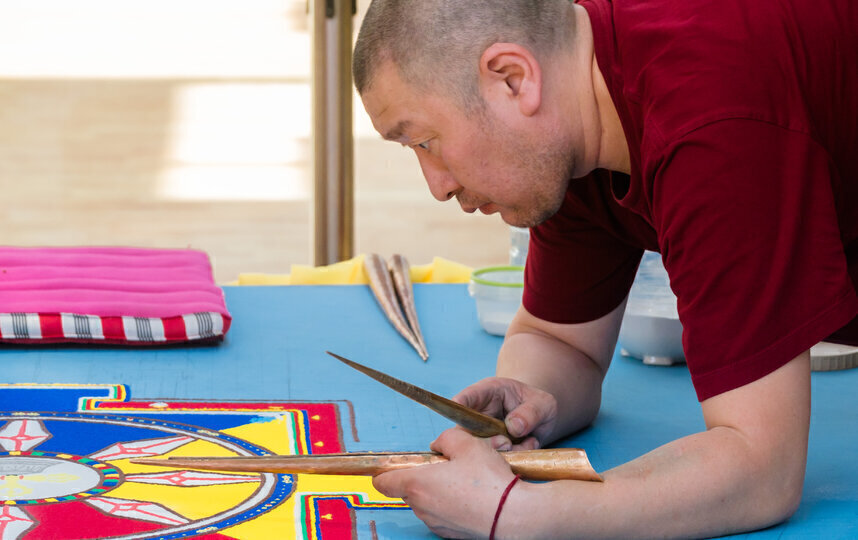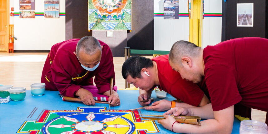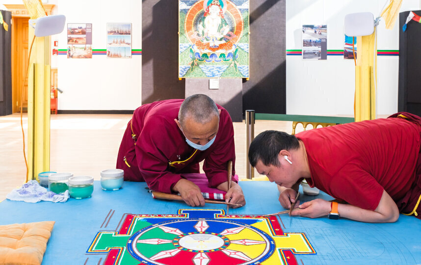 В течение недели трое лам из петербургского буддийского храма "Дацан Гунзэчойнэй" работали над сложным рисунком, собирая его из разноцветных песчинок.